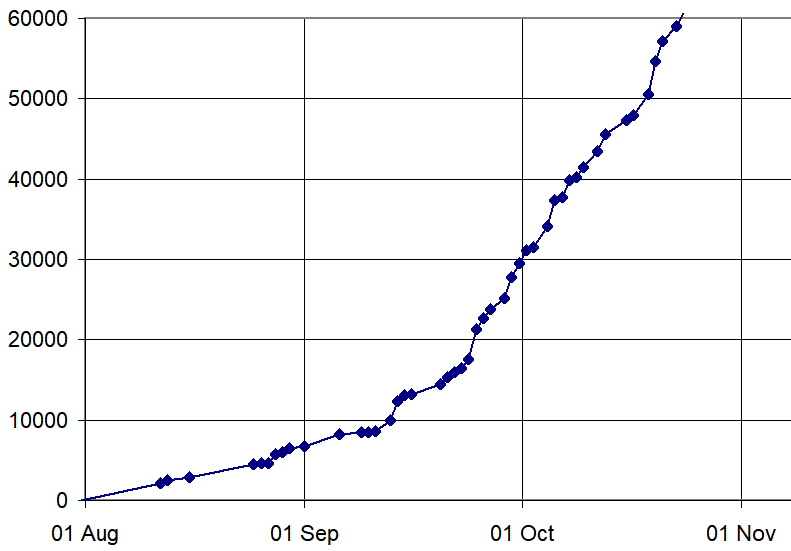Sometime in late August, Linda asks me how I'm progressing. I check the word count and it's only about about 6000 words - 10% to 12% of my target with a third of my writing time gone! This isn't Writer's Block, it's just me not putting in enough effort. I go back through the Git repository and note down word counts for every day that I'd done some writing, put them into an Excel spreadsheet, and told it to draw a graph. Hmm, I'm going to be finished somewhere around the start of May, and that isn't without any tidying up, revision, or dealing with family emergencies. Linda tells me that I'm suspending any other projects I'm working on and doing nothing in the evenings except writing.
